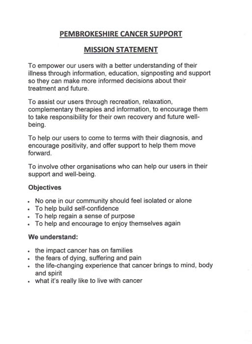 The Pembrokeshire Cancer Support Group was established in 1991, by Doreen Wormell. Doreen felt that as a Cancer Sufferer there was a gap between the patient being diagnosed and being able to come to terms with the fact that they have Cancer. Doreen was convinced that the answer was to start a Support Group in Pembrokeshire for those who had Cancer, or have had Cancer and their Carers, Friends and Family. Support came from other sufferers to start a group. Great support also came from Jane Calvert, Stoma and Breast Cancer Nurse at Withybush Hospital and Janet Griffiths, a Macmillan Nurse. The group was charged with the primary purpose of improving and maintaining the quality of life for those who have or have had Cancer and to offer support for their Carers, Family and Friends, through a non nursing environment. For a few years the group met, twice monthly, on an informal basis at the Cleddau Bridge Hotel in Pembroke Dock. As the group grew they gained recognition from the Local Health Authority for the Services they were providing.