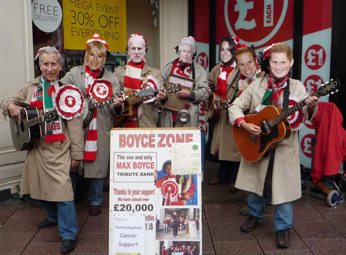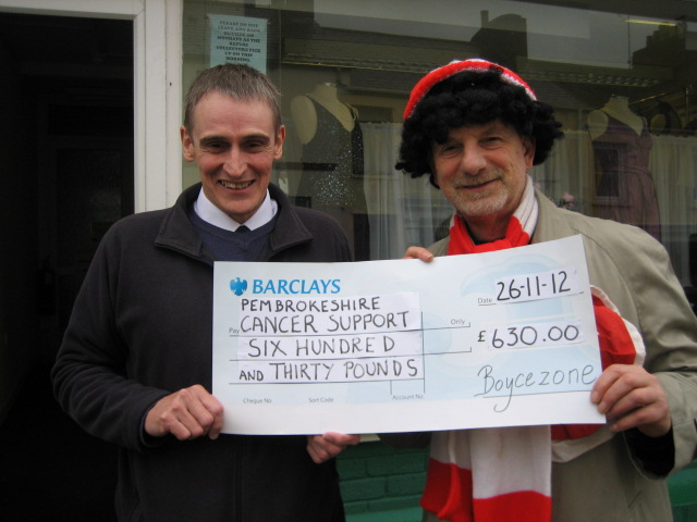 Pembrokeshire Cancer Support has to say a very big Thank You to Mr Hugh Griffiths and his partners in “Boycezone”, which is a Max Boyce Tribute Band (the bands hero!!). On Saturday 10th November the band busked around Cardiff on the day of the Wales v Argentina Rugby International. A superb total of £630 was raised to help the Charity. Hugh nominated Pembrokeshire Cancer Support to be the Charity of the Day, and we thank him for that. Boycezone have raised over £26,000 for good causes by busking at Rugby Internationals since their first in 1999. Hugh came to the Pembrokeshire Cancer Support Centre in Pembroke Dock to present the cheque to Charity Coordinator, Lyn Neville. Lyn said, “we are very grateful for the support of Hugh and Boycezone, and the generosity of the rugby fans on the day. This will help greatly to enable us to keep supporting local Cancer sufferers and Carers”.