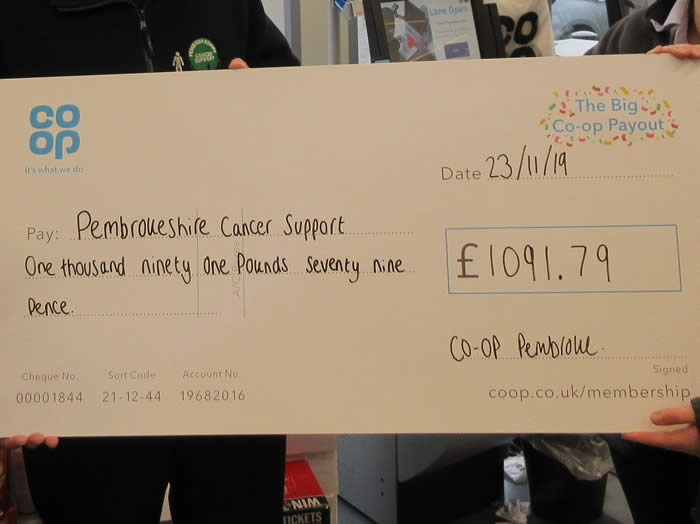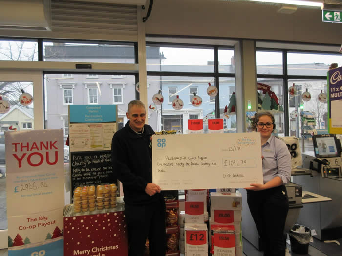 Lyn (Charity Coordinator) went along today to meet Katie who is the Store Manager of the Co-Op in Pembroke. Lyn was presented with a fantastic cheque for £1091.79!! Over the last 12 months Pembrokeshire Cancer Support has been one of three local Charities who have benefitted from the Co-op Community Fund (which has given over £17 million to good causes throughout the UK this year). We thank the Co-Op, Katie, the staff and all the Customers for their support of our Charity.