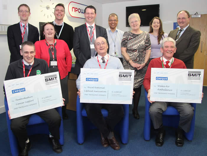 Pembrokeshire Cancer Support, Wales Air Ambulance and Angle RNLI each received a donation of £1,000 from Royal SMIT Transformers BV who have recently completed a major project at Pembroke Power Station. "We are celebrating 100 years as a company and were the last to be granted Royal approval by the Queen of the Netherlands before her abdication," said Jos Doumen, Regional Manager of Royal SMIT Transformers BV. "We are very pleased to hear about the work being carried out by these volunteers in the local community and to be able to support these worthy causes." The charities were nominated for the donation by Pembroke Power Station as they have been the employees' chosen charities for the last three years. Production Manager Will Jeffery added that the site is very pleased with the success of project and happy that the local charities have benefited too. The photograph shows representatives from the three charities with members of the Pembroke Power Station team and Royal SMIT Transformers BV at the presentation at the site.