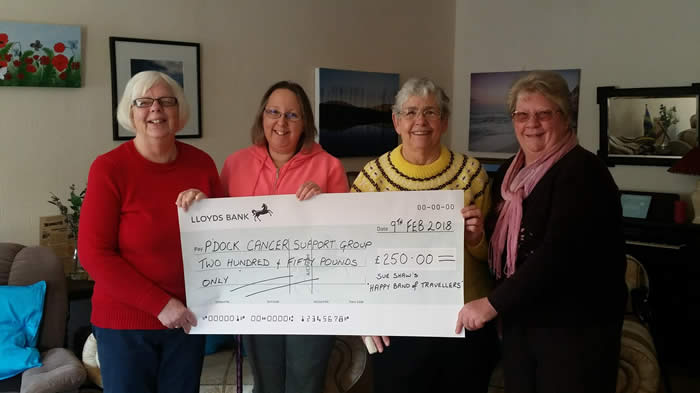 Pembrokeshire Cancer Support had a lovely surprise on Monday this week when we had a visit from Susan and John Shaw of the "Happy Band of Travellers". They organised a recent trip to Alvaston Hall where they did some fundraising activities. They presented us with a cheque for an amazing £250. The photo shows Sue with some of our Monday Card Group, Sheila, Gillian and Gwyneth. We thank the Happy Band for their support!!