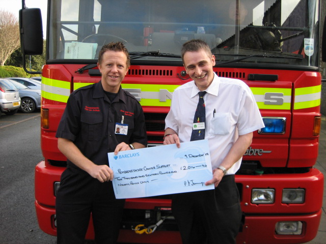 We are extremely grateful for the amazing donation from the "Marathon Running" Fireman, Peter Jennings, who is a Pembroke Dock boy. Peter ran the New York Marathon on 2nd November, 2008. He ran the superb time of 3 hours and 31 minutes. He raised money for the Fire Fighters Charity and for us at Pembrokeshire Cancer Support. We were all amazed when Peter came in with a cheque for £2,016.90 and an Engine full of Firemen ! We need to install new firedoors at the Support Centre so Peter was happy that the money will pay for fire safety and much more. Thank You very much Peter !! (December 2008)