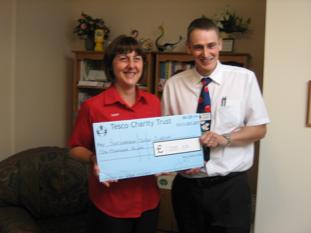 The Tesco Charity Trust have very generously donated £1,000 to the Support Centre for us to make improvements to our successful Card Making group and to provide Entertainment products for us to hold Whist Drives etc. Ruth Howell, who is the Tesco Community Champion for the Pembroke Dock Superstore, came to present the cheque on the 14th September, 2009. Ruth has been a great support to the Charity and helps in lots of other ways - Thanks Ruth !!