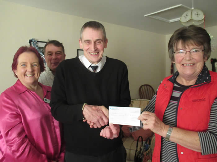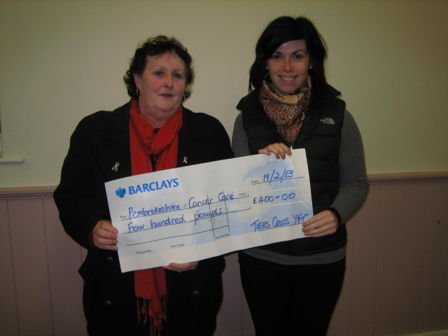 Barbara Miller (Senior Support Worker) went along to the Tiers Cross YFC to be presented with a cheque for £400 by Miss Non Thorne (Chairman). The Tiers Cross YFC Members worked hard over the festive period with lots of Carol Singing and raised this fantastic amount. Part of this sum raised will be used to train a staff member in basic Acupuncture to help with Pain and Stress Relief for the people who use our Cancer Support Centre and Outreach Services.