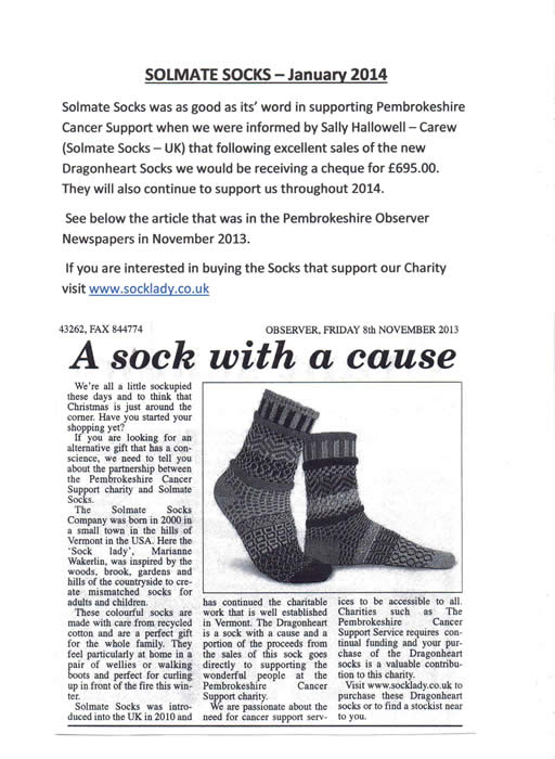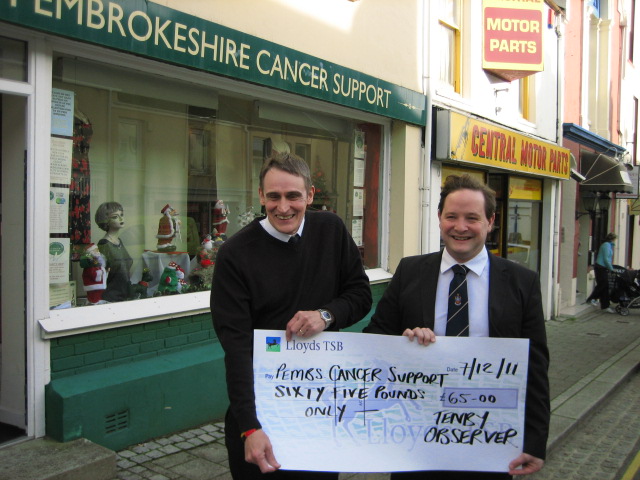 Pembrokeshire Cancer Support had an early Christmas present this week thanks to the Tenby Observer. Lyn, The Charity Coordinator, is seen receiving the cheque from Tenby Observer General Manager, Mr Andy Adamson (and yes it was a very windy day !!). This donation was following on from a Breast Cancer Awareness feature in the Observer papers.