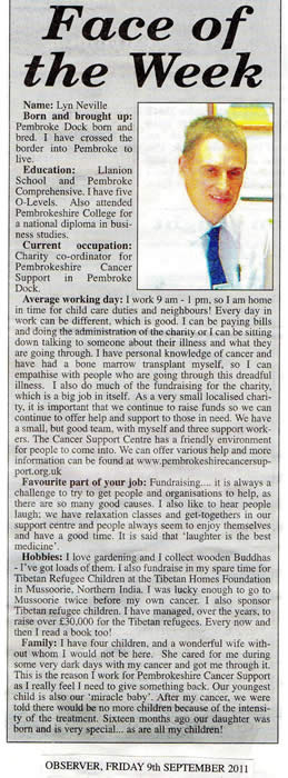 The fundraisers from the Pembroke group "Keep It Local" have certainly done just that with a donation of £2,000 to our charity. Much hard work and organisation has gone into raising this money. Jane Rogers, Jeanette Birch and Emma Hughes are no strangers to early morning Car Boot Sales, Bingo Competitions, Raffles and anything else that can raise money to help local people. The photograph shows Lyn receiving the cheque from Jeanette Birch (Treasurer). We are very pleased to receive this very generous donation which will help us to maintain our services to local people with Cancer.