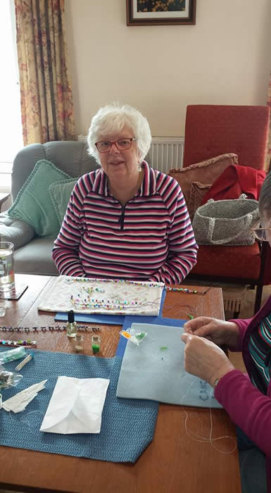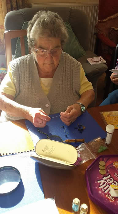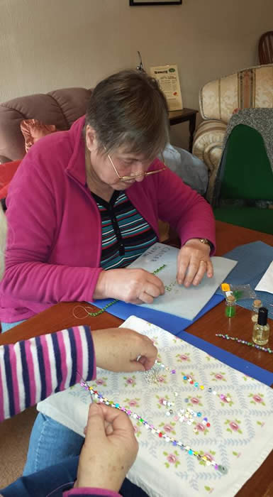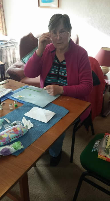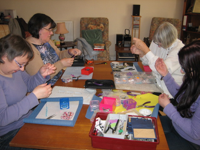 The Craft and Card Group meet at the Support Centre in Queen Street, Pembroke Dock every Wednesday at 10.30am. The photographs show a Jewellery Making Session but the Group often make Greetings Cards (for all occasions) which are sold to raise funds for the Charity (they also make cards for relatives etc). The group always has lots of fun whatever they are making and any member is welcome to come along and join in.