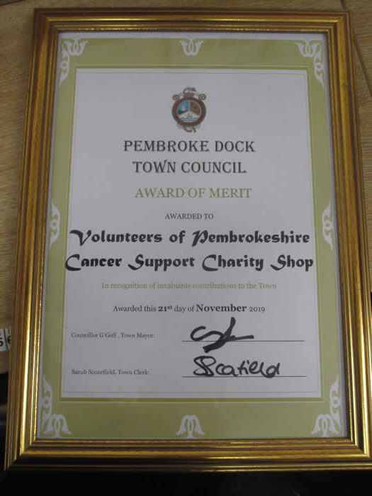 Congratulations!! On Thursday 21st November the Pembrokeshire Cancer Support Charity Shop Ladies went along to Pembroke Dock Quins Club to receive a Pembroke Dock Town Council "Award of Merit" in recognition of an invaluable contribution to the Town. All at the Charity are really "Proud" of the fabulous job that is done by our amazing volunteers - Thank You all !!